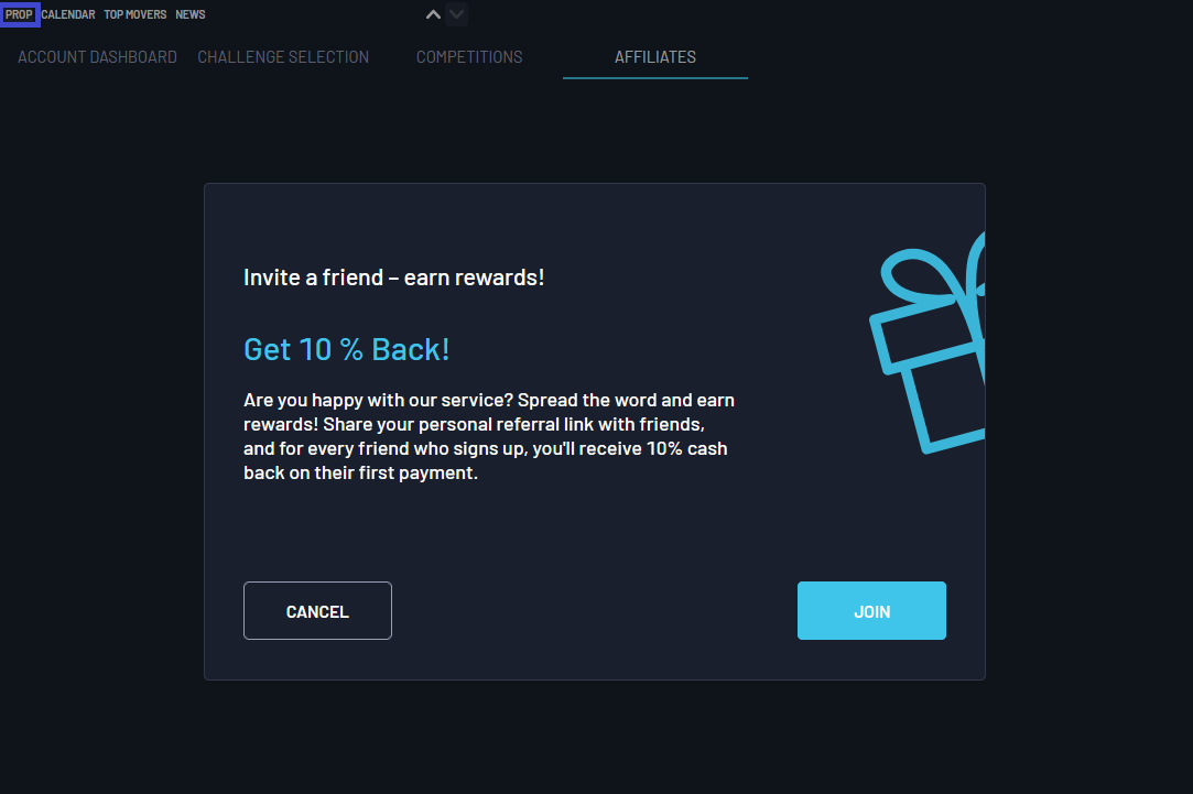 Join the Affiliate Program: After logging in, click on “Prop” in the top menu, navigate to the Affiliate section, and join the program directly from your dashboard.